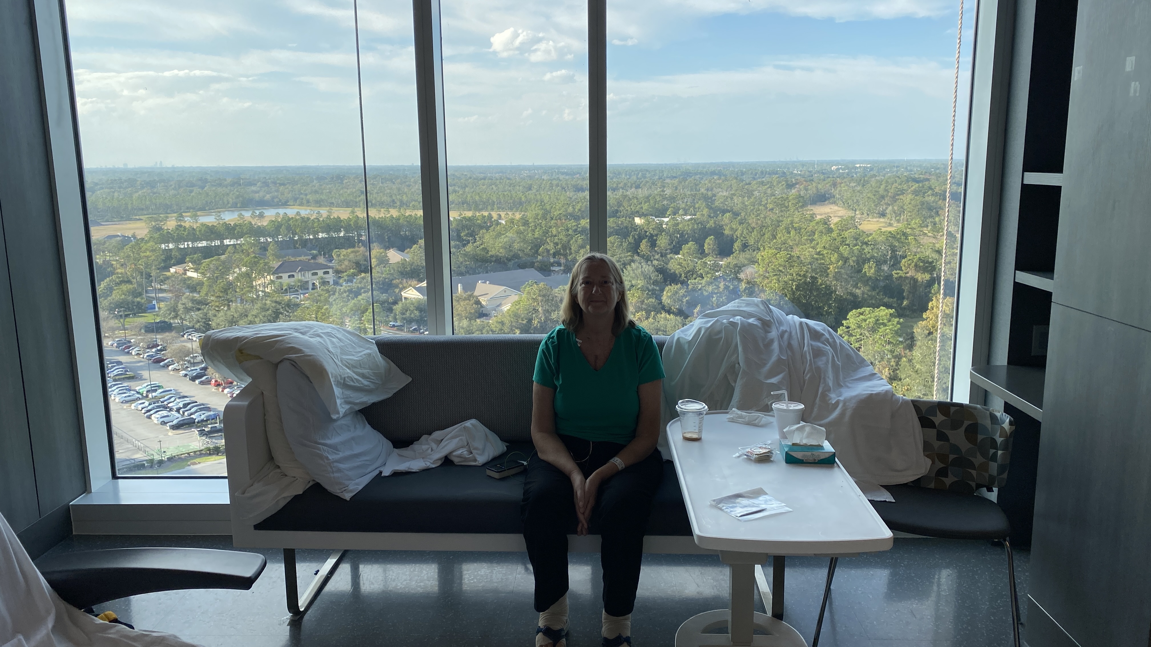 If I have to wait anywhere I’m so glad I’m at the Mayo Clinic and with this team. The staff and doctors are exceptional and go out of their way to make sure us long term patients are happy. I was moved to a room with a huge glass wall overlooking the intracoastal and the Atlantic in the distance and see the sun rise every morning. (Not so much with all this rain). We are strongly encouraged to exercise as much as possible to keep our muscles strong before surgery and to wear our regular clothes. You can’t tell us from the visitors, except for the IV poles and monitors. LOL. We even wear a GPS tracking bracelet so they know where we are at all times. We’re only allowed to stay on this floor except when we get ‘sunshine privileges’ and are escorted downstairs and outside with a 5 person escort for about half an hour! There are 4 of us here now who are pre-transplant and we get together to play cards once in a while. It helps to pass the time.