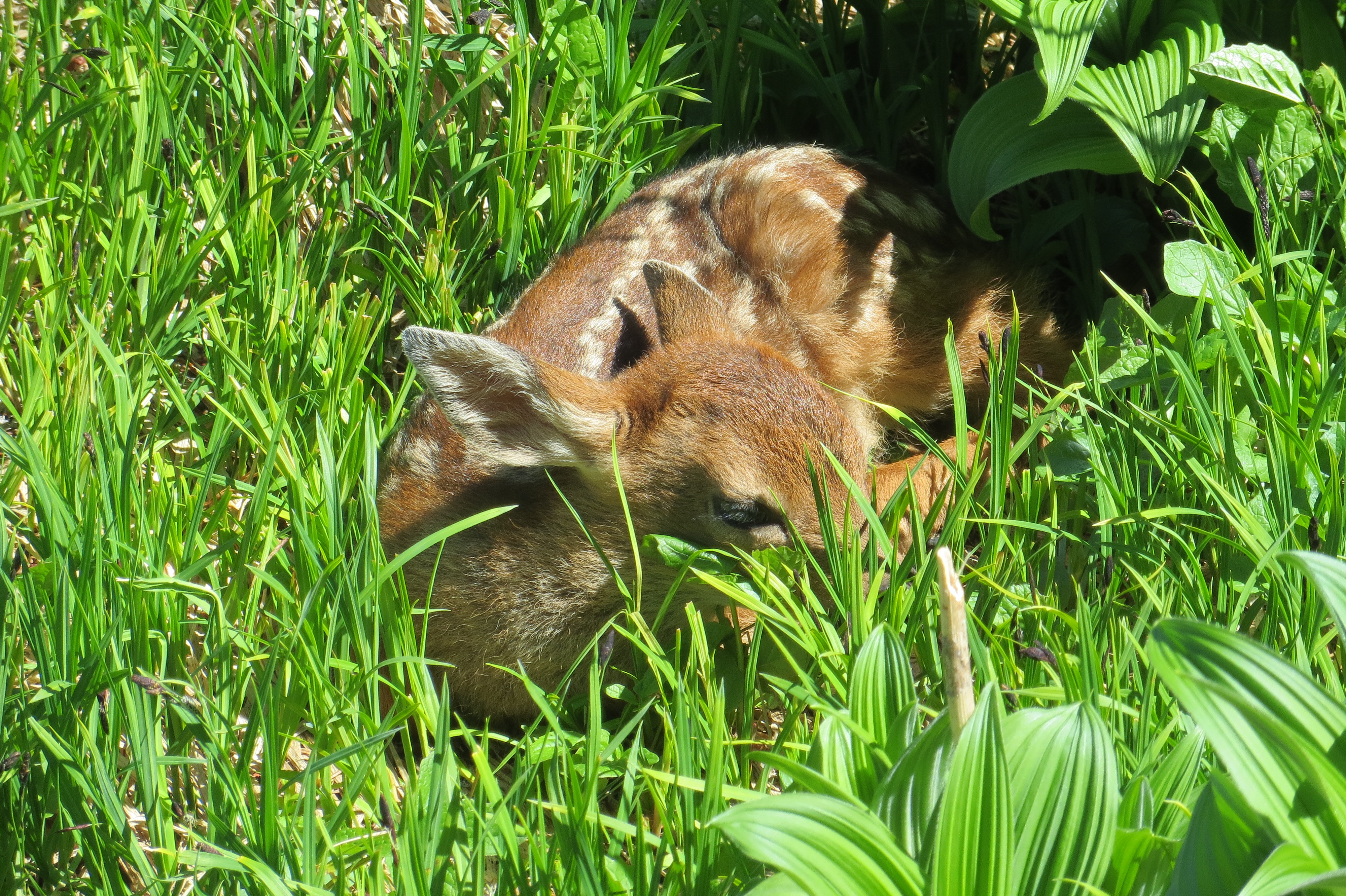 While walking on one of the trails we came upon a small fawn only about 10 ft off the trail. It did not move as people took photos and the mother grazed contentedly not far away. Then when we were eating a picnic lunch we were visited by 2 other deer, one with velvet on his antlers. What a great experience.