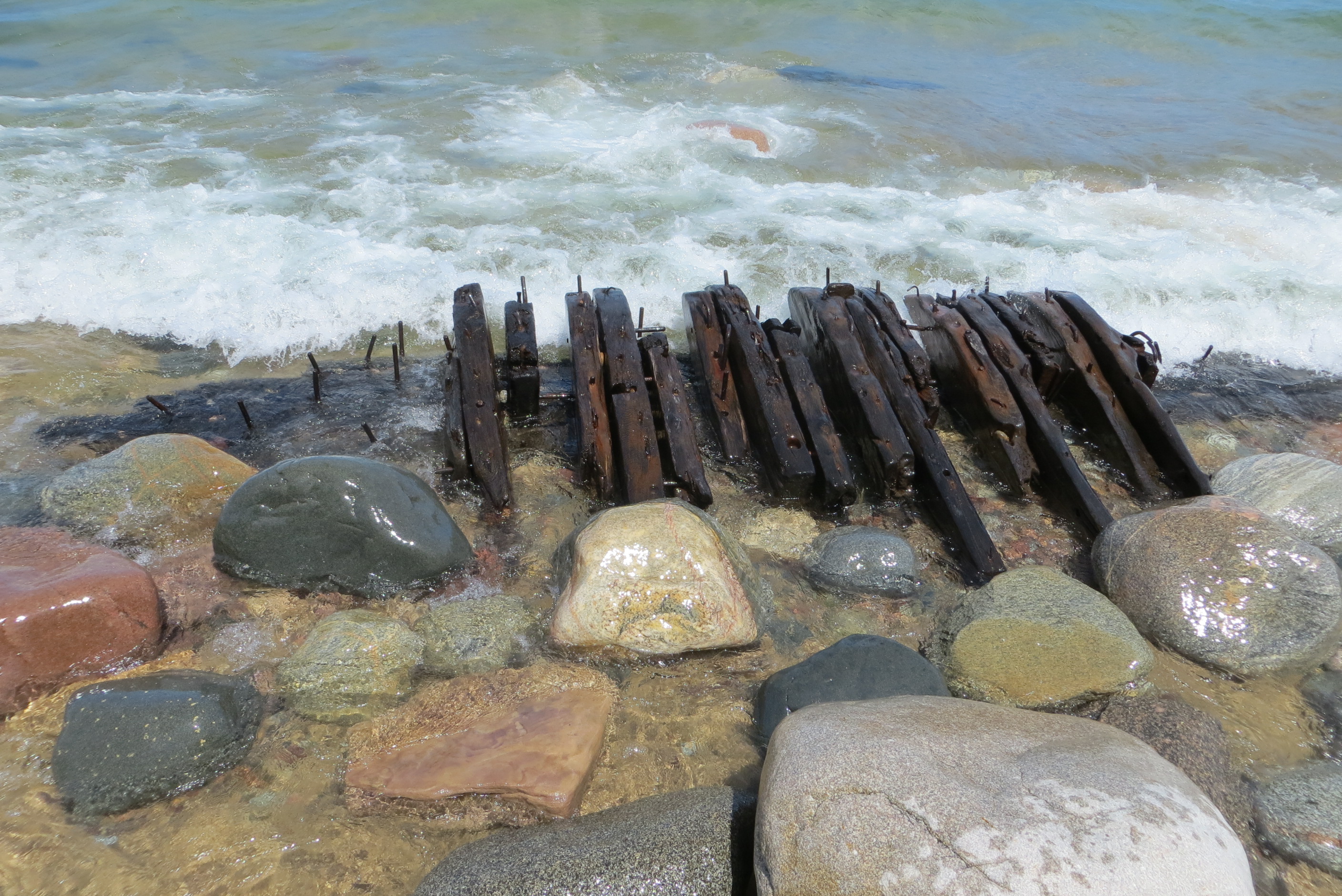 This area on the southern shore of Lake Superior is known as “Shipwreck Coast”.  It is so named because the sandstone reef is only 6 feet below the surface and extends for nearly a mile into Lake Superior.   The Au Sable Point reef was known as a “ship trap” that ensnared many ships and the ruins of several of these shipwrecks dating back to the late 1800’s can still be seen washed up on the beach.  The wooden timbers have been remarkably well preserved due to the cold temperature of the water.